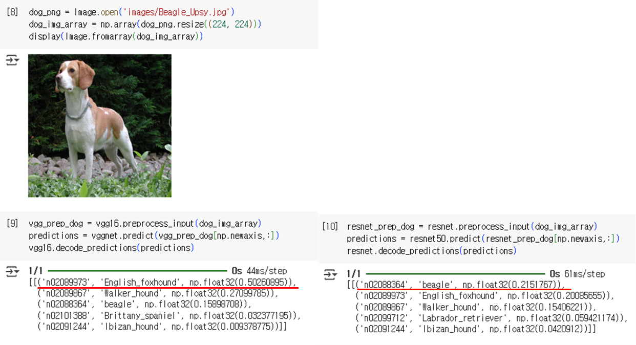 - 특히, VGG16이 비글 이미지를 잉글리시 폭스하운드로 잘못 인식했지만, ResNet50은 비글로 정확히 분류했습니다. 이는 ResNet50이 잔차 블록과 스택으로 미묘한 시각적 특징을 더 잘 포착했을 것이라고 생각합니다.