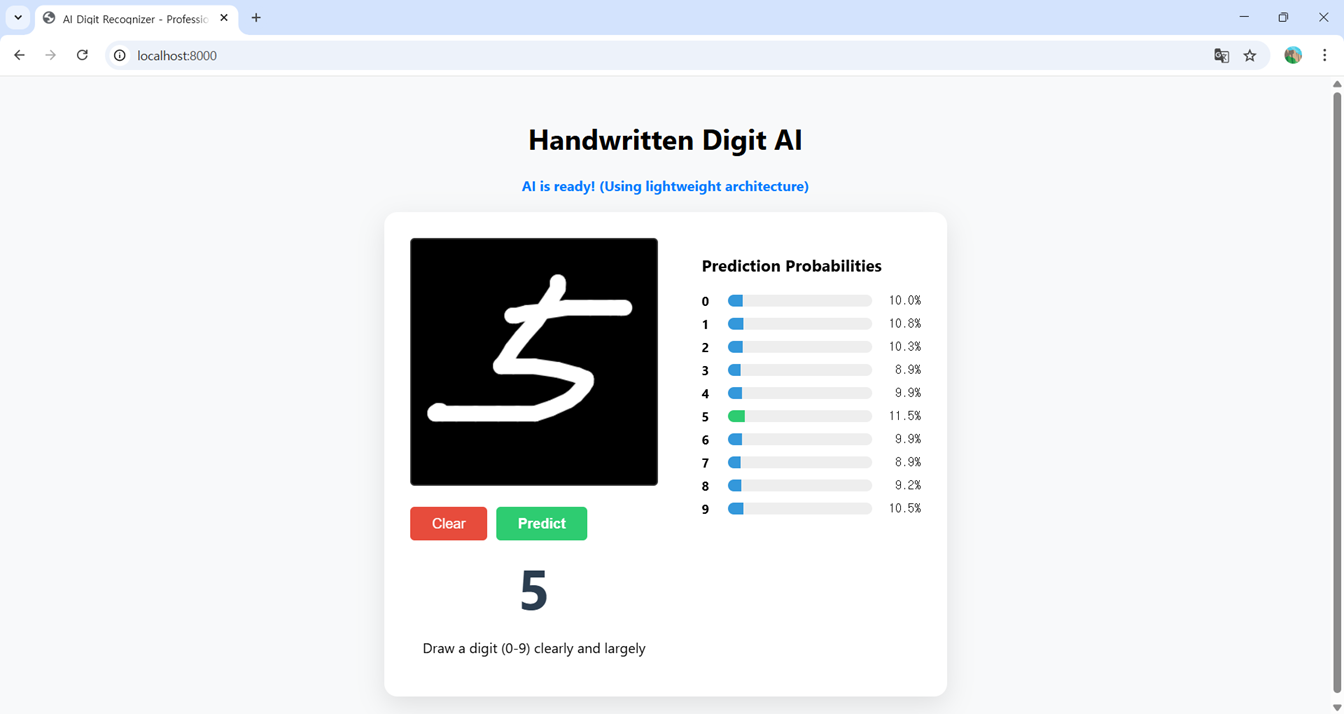 - 확률 시각화: 처음에는 단순히 예상값만 출력했지만, 기능을 개선하여 각 숫자별 예상치를 실시간 막대그래프로 표시했습니다.