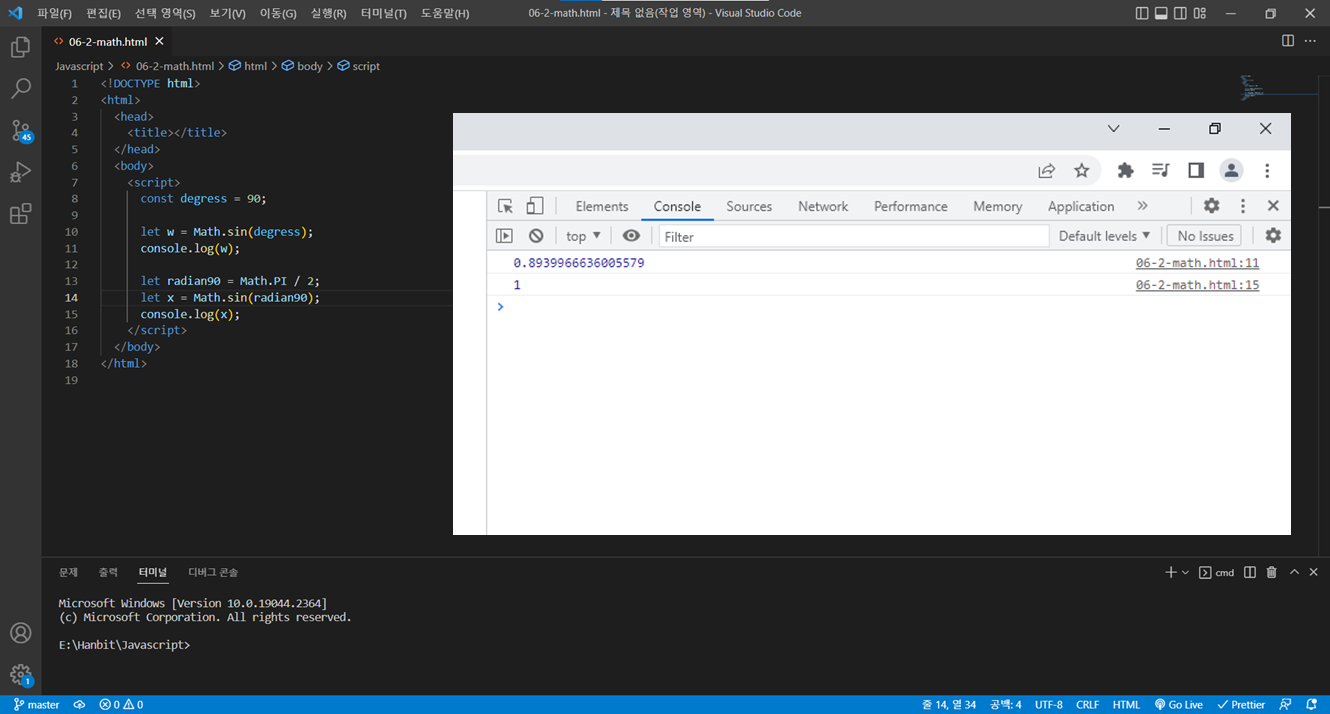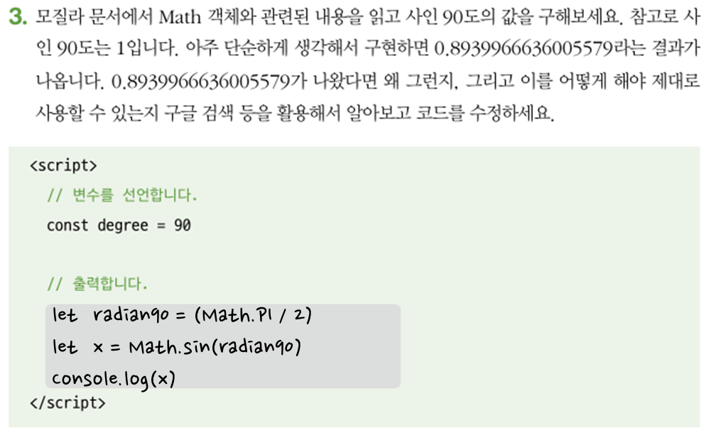 따라서 x값은 라디안인 π/2로 지정해야하며, 이는 (Math.PI / 2) 입니다. 이렇게 계산하면 결과가 1로 나옵니다.