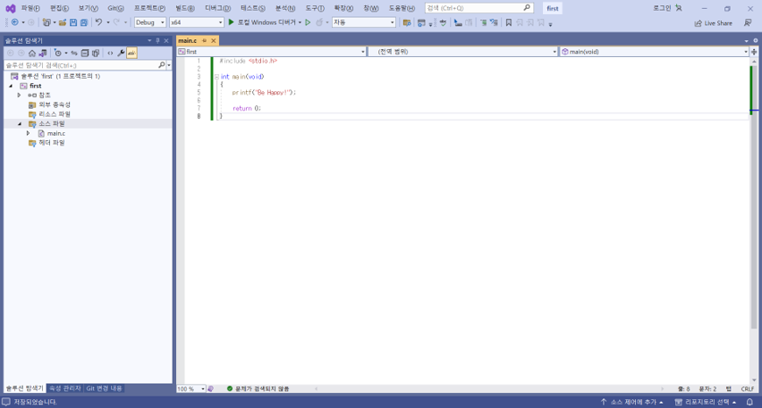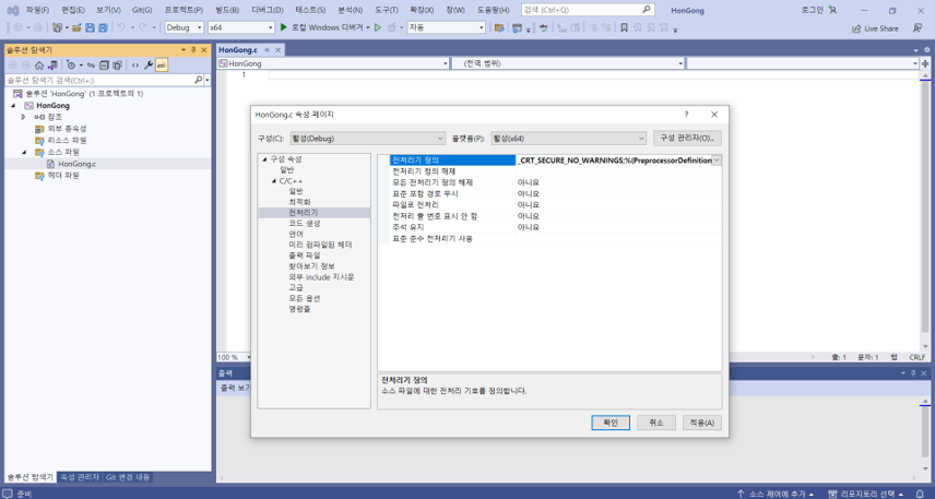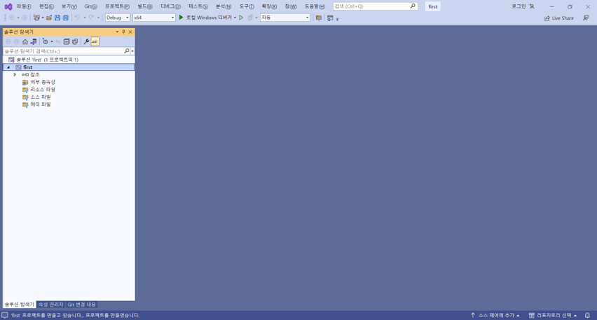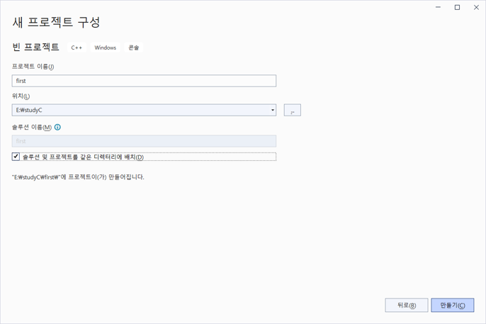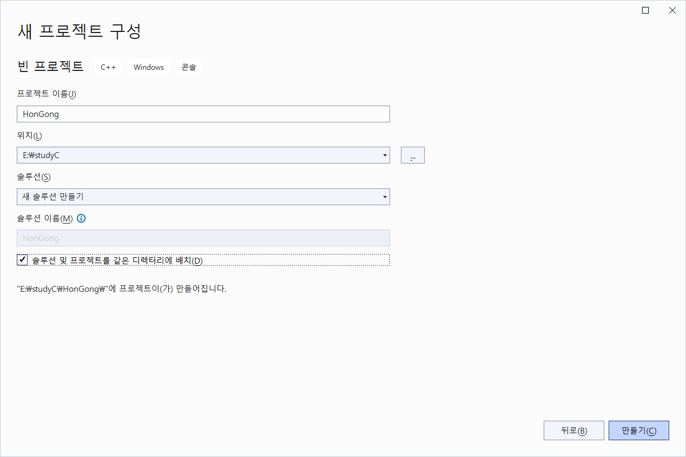 - 프로젝트 및 파일 생성: [새 프로젝트 만들기]-[빈 프로젝트]-[추가]-[새 항목]-[Visual C++]-[C++ 파일]