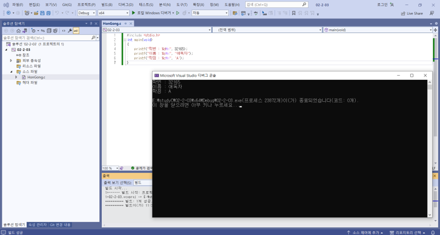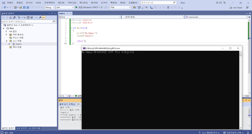 - 실행 파일 실행: [디버그] - [디버그하지 않고 시작] (Ctrl+F5) → Debug 폴더에 실행파일 실행