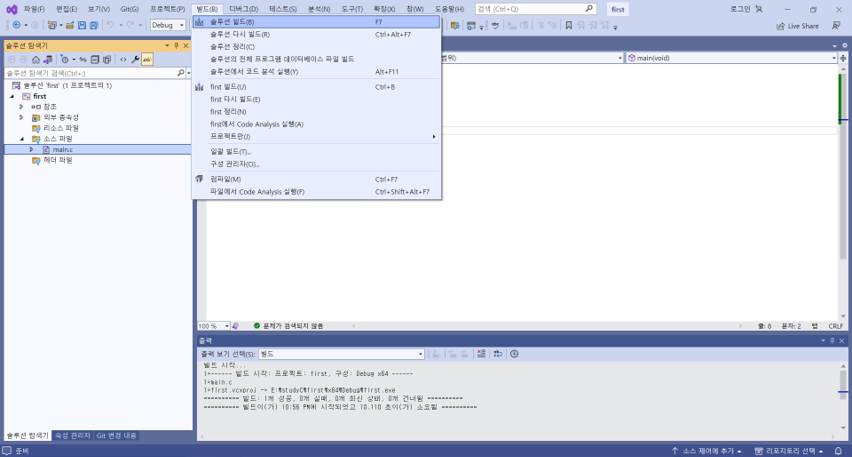 - 컴파일: 소스 코드를 컴파일러를 통해 컴퓨터가 이해하는 기계어로 만드는 과정 [빌드]-[솔루션 빌드] (Ctrl+Shift+B)