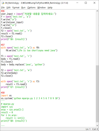 - 파일을 쓰기 모드로 열어 내용 쓰기: 쓰기모드로 파일을 열고 for을 통해 파일 객체 f의 write 함수를 사용