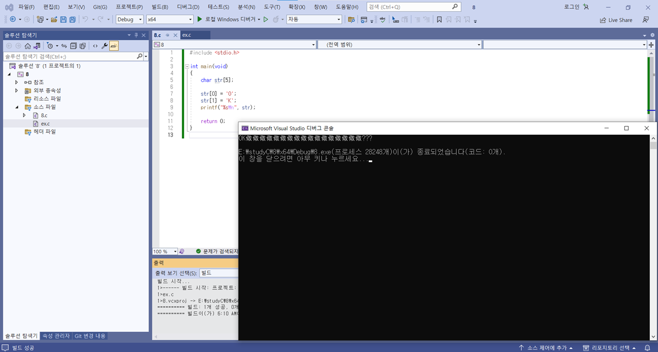 | char형 배열 초기화 | char str[80] = "apple"; | char형 배열은 문자열로 초기화 문자열에 끝에는 널 문자 존재 |
