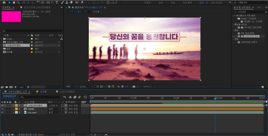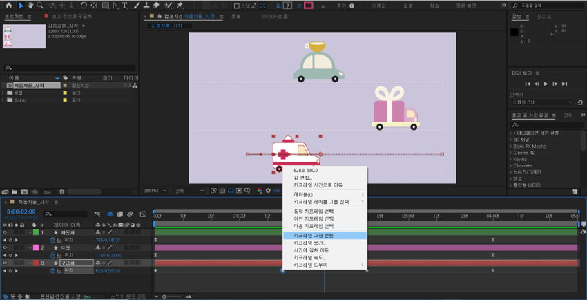 . 키프레임(Keyframes): 특정 시간에 원하는 값을 입력하고 스톱워치를 클릭하여 생성
