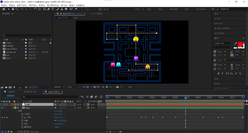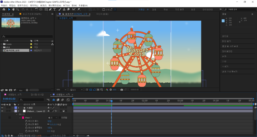 . 패스 애니메이션: 지정된 경로에 동일한 스피드로 움직여야 할 때, 마스크 패스를 복사하여 위칫값에 붙여 정확한 경로를 따라 움직이는 동작을 제어 가능