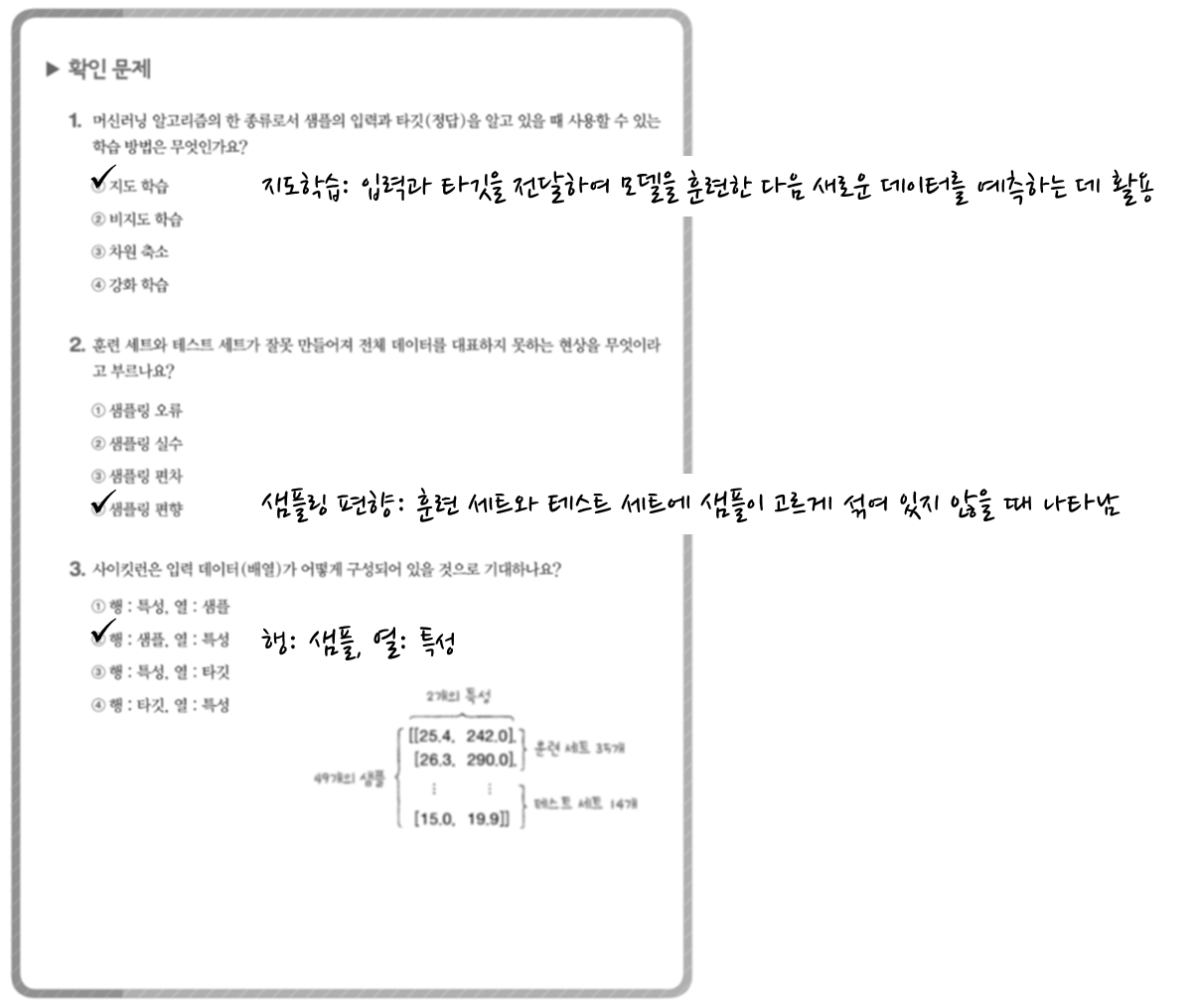 . 훈련 세트: 지도 학습의 경우 필요한 입력(데이터)과 타깃(정답)을 합쳐 놓은 것 (모델을 훈련할 때 사용하는 데이터)