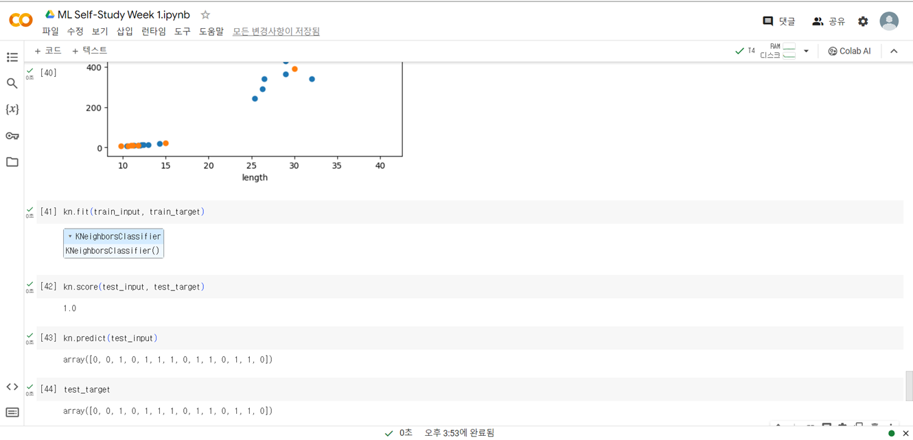 . 훈련: 머신러닝 알고리즘이 데이터에서 규칙을 찾는 과정 (사이킷런에서 fit 메서드의 역할)