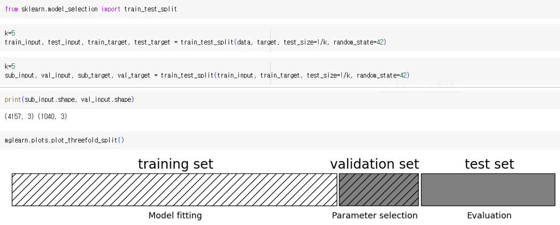 - 검증 세트: 하이퍼파라미터 튜닝을 위해 모델을 평가할 때, 테스트 세트를 사용하지 않기 위해 훈련 세트에서 다시 떼어 낸 데이터 세트